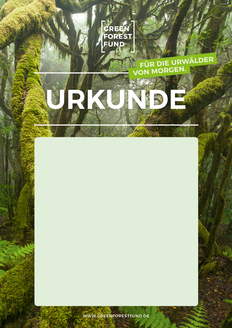 Herzlichen Glückwunsch! Ob zur Taufe, zum Geburtstag, als Weihnachtsgeschenk, zum Jubiläum oder zur Hochzeit: Mit deinem Baumgeschenk gratulierst du nicht nur dem Beschenkten, sondern hilfst auch der Umwelt. Und als bleibende Erinnerung erhältst du eine schön gestaltete, digitale Urkunde für den Beschenkten, die du auf Wunsch auch über unseren Druckservice auf 100% Altpapier ausdrucken lassen kannst. Auf welcher Fläche dein geschützter Wald für immer steht, siehst du in unserem [ Urwaldtracker ]. Anhand dieser Baumnummer ist der Beschenkte jederzeit in der Lage, seinen Baum zu finden: auf unseren eigens dafür erworbenen Grundstücken, auf denen die Bäume nicht gefällt werden und wir ihnen ein lebenslanges Wachstum garantieren.