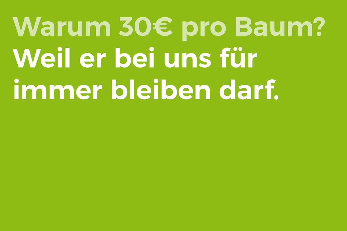 Ganz einfach: Weil wir den Klimawandel stoppen müssen. Jetzt. Bevor es zu spät ist. Und mit uns kannst du einen einzigartigen Beitrag dazu leisten: Wenn du über uns einen Baum verschenkst, schützt du nicht nur das Klima, sondern auch die Lebensgrundlage vieler Lebewesen. Auf einer geschützten Fläche, die wir in die Gemeinnützigkeit kaufen, und auf der dein Baum-Geschenk lebenslang wachsen darf, ohne wirtschaftliche Nutzung. Du schaffst mit uns neuen, unberührten Lebensraum zum Schutz von Pflanzen und Tieren. Wir erwerben all unsere Flächen, werten sie ökologisch auf und setzen die Naturschutzprojekte selbst um. Aus Leidenschaft für die Natur und Tierwelt